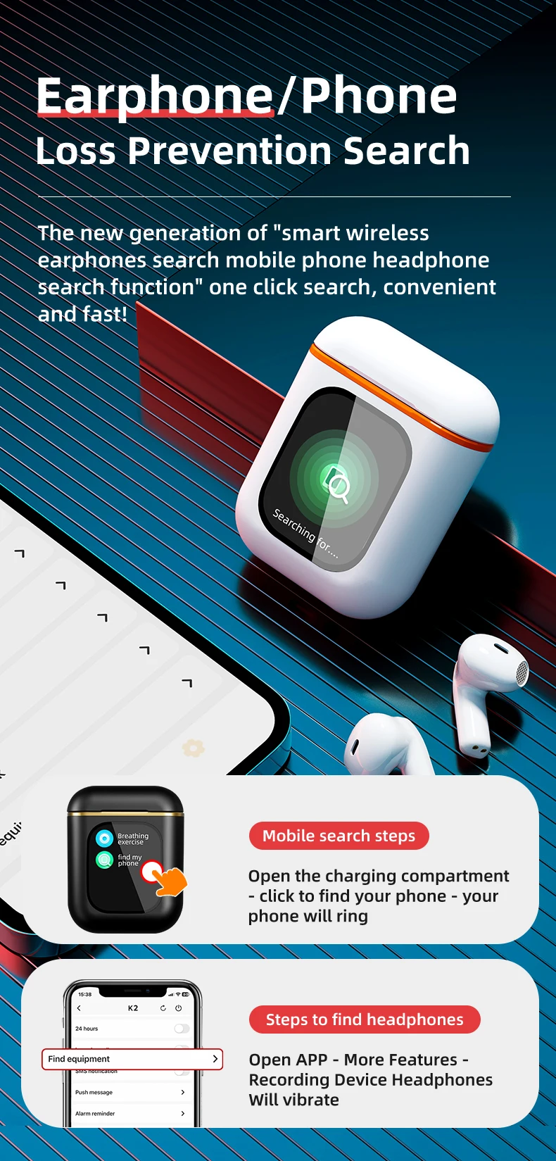 Air Pro Max K2 TWS Earphone New Arrival APP Control ENC LCD Smart Touch Screen Local Music TF Card True Wireless Earbuds