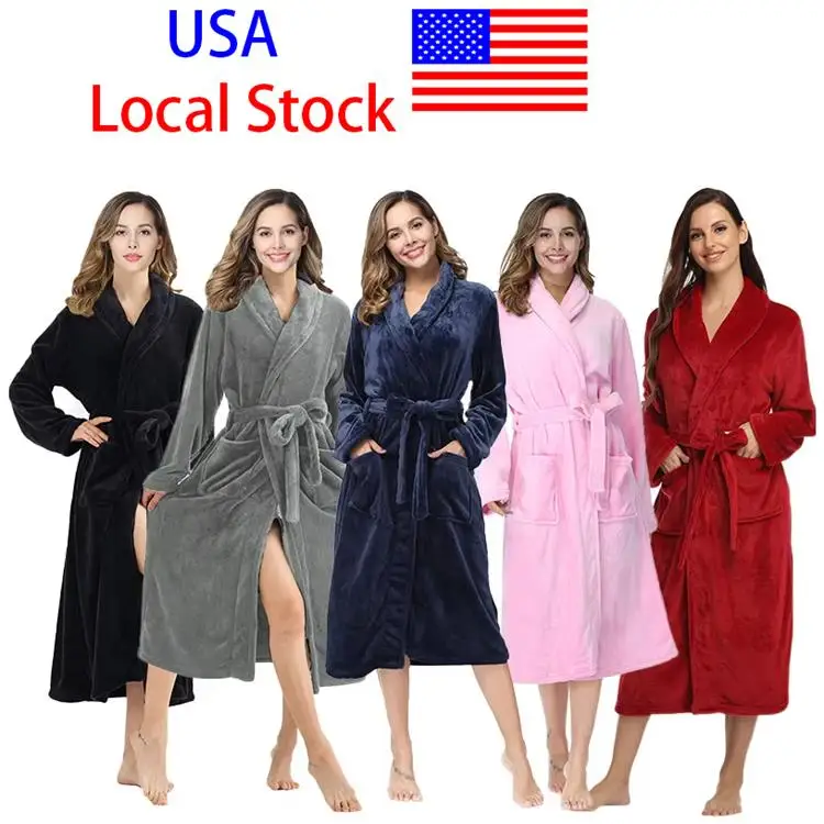 US Warehouse Soft Winter Plush Bath Robe Hooded Adult Polyester Oversize Unisex Flannel Long Bathrobe Woman Man Sleepwear